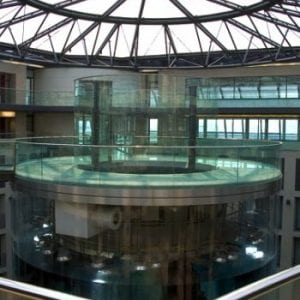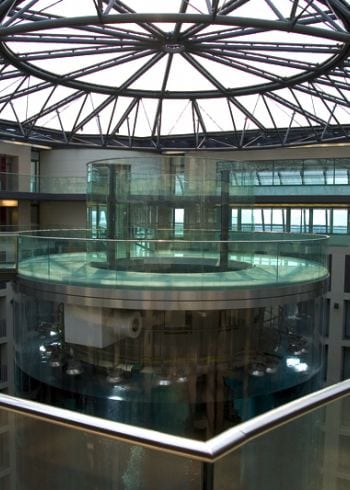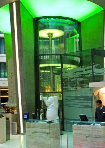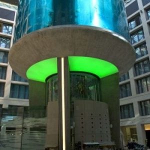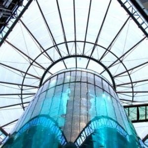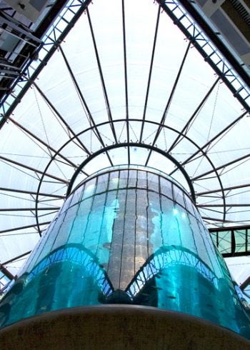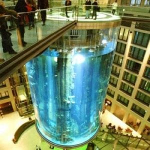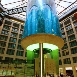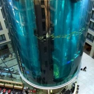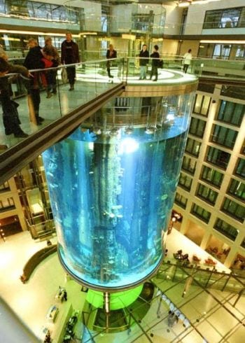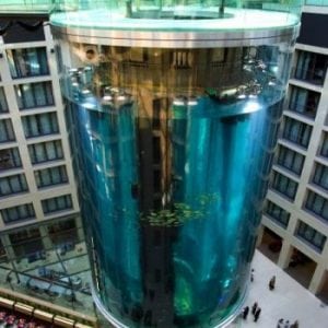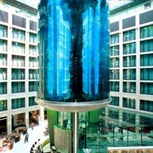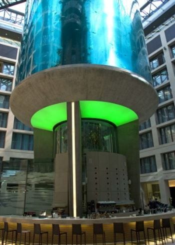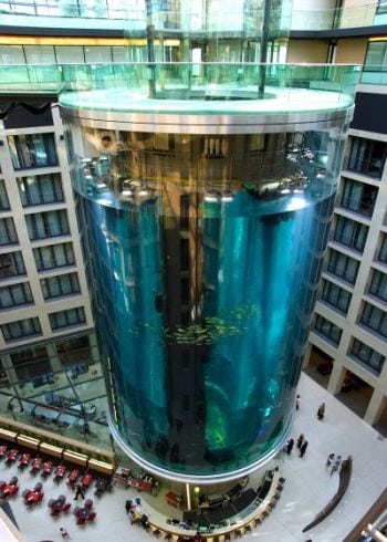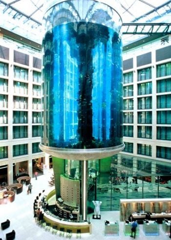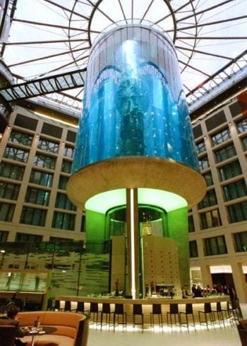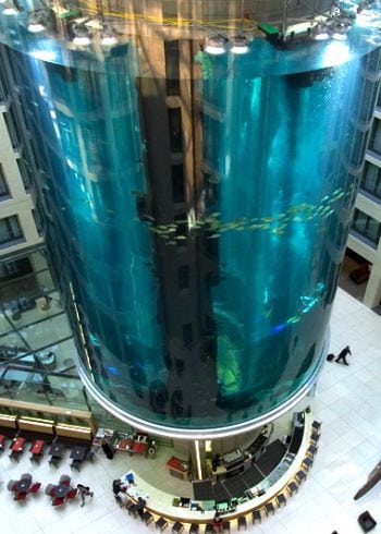 The lobby of the Radisson Blu Hotel in the city center of Berlin houses the biggest cylindrical aquarium of the world.