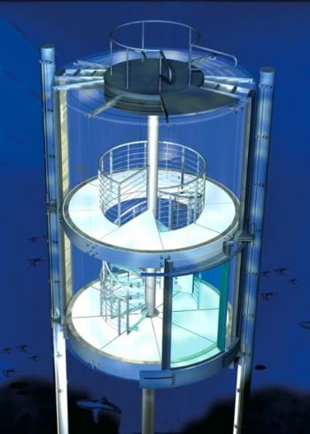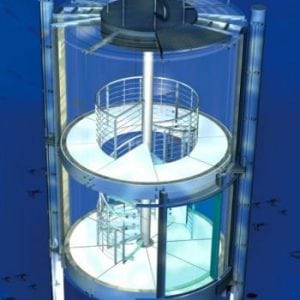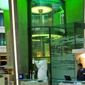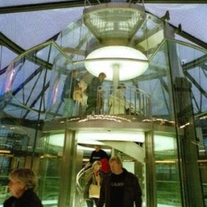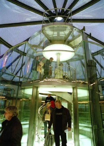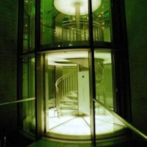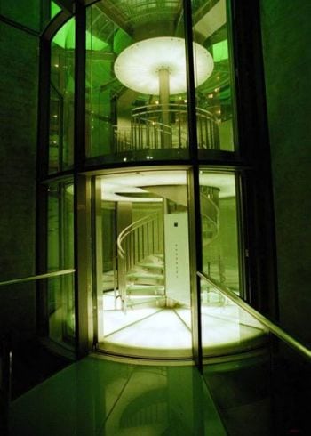 Ceiling and floor of the lift cars are illuminated and made of glass. In order to have a perfect view of the 1500 tropical fish, the glass walls and car ceiling are joined without any disturbing frame.