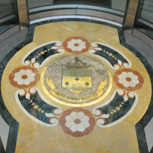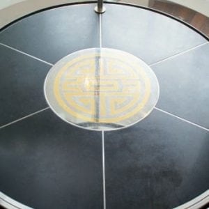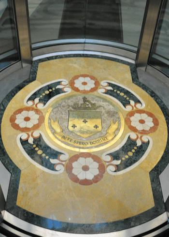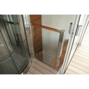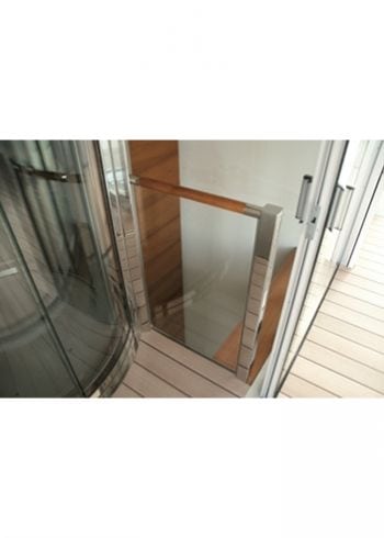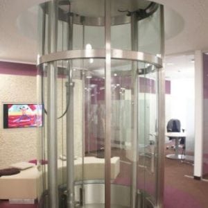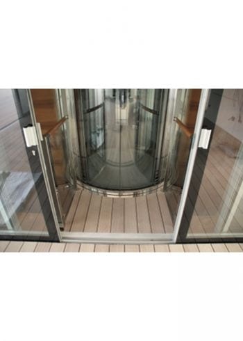 Die Kabine besticht durch die ausgewogene Verbindung von Edelstahl, intarsiertem Steinfußboden und Rundumverglasung.