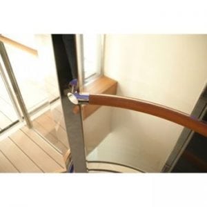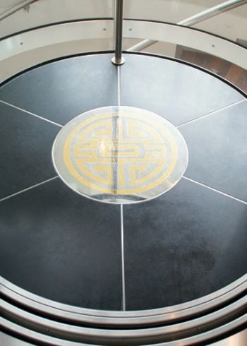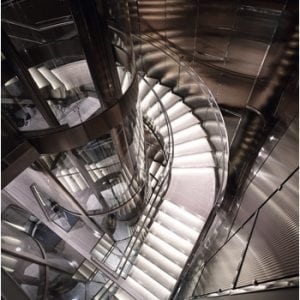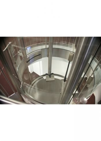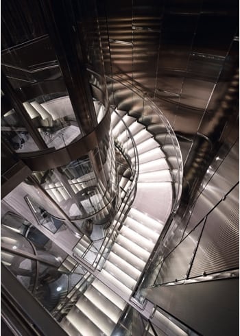 Die Oberflächen des Schachtgerüsts und der Türeinfassungen sind in geschliffenem Edelstahl gehalten, Schacht und Kabine sind komplett verglast. Der Aufzug, bestückt mit den GBH-eigenen Schacht- und Kabinentüren aus Glas mit unten liegendem Türantrieb, gleitet leicht und elegant durch das renommierte Gebäude. Die von uns mitgelieferte, maßgeschneiderte Treppe folgt dem Verlauf des runden Aufzugs, sodass beides zusammen eine harmonische Einheit ergibt.