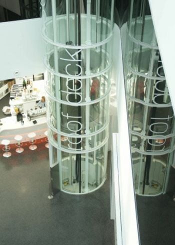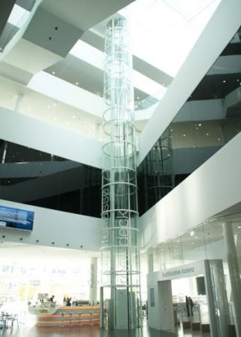 Der von GBH konstruierte gläserne Panoramaaufzug im Foyer fügt sich harmonisch ins Gesamtkonzept. Er bringt Besucher nonstop auf die begehbare Dachterrasse.