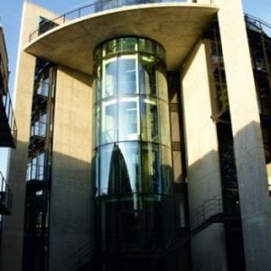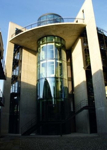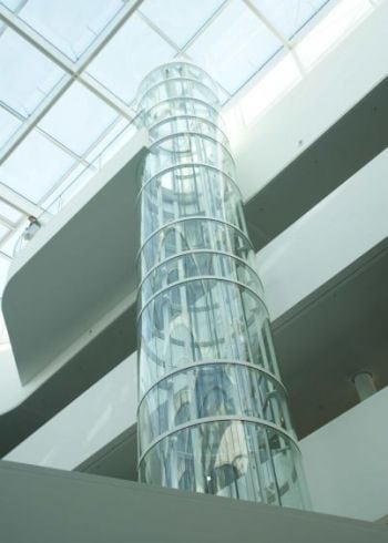 An das zylindrische Bürogebäude wurde eine runde Glasaufzugsanlage in ein rundes, verglastes Treppenhaus platziert.