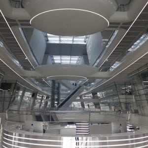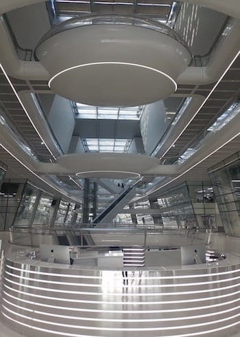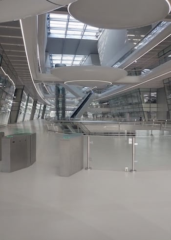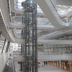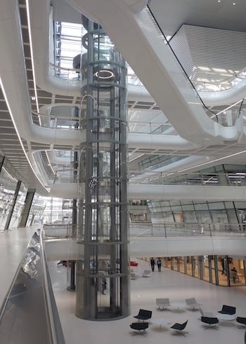 Das repräsentative Firmengebäude wurde vom Architekturbüro post & partner entworfen. Die GBH Design-Aufzüge fügen sich harmonisch in die gerundeten Formen im Inneren des Gebäudes ein. Der von GBH entwickelte unten liegende Türantrieb, in Kombination mit den Glastüren, verleiht dem Ganzen Leichtigkeit und Transparenz.
