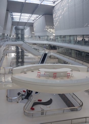 Die filigrane, weiß lackierte Schachtkonstruktion integriert sich hervorragend in das ganz in Weiß gehaltene Gebäude.