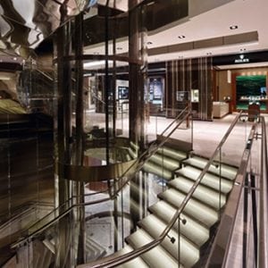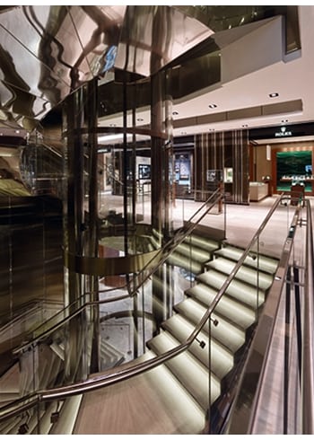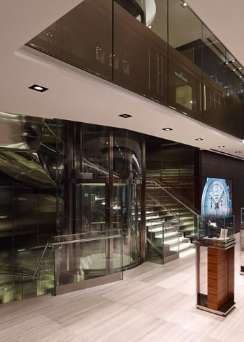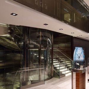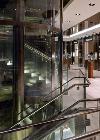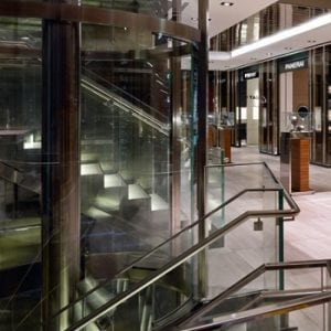 Unser individuell gefertigter Glaslift wurde dem Interieur des Stores angepasst. Alle Edelstahlteile des Schachtgerüstes und der Aufzugskabine wurden champagnerfarben gefärbt.