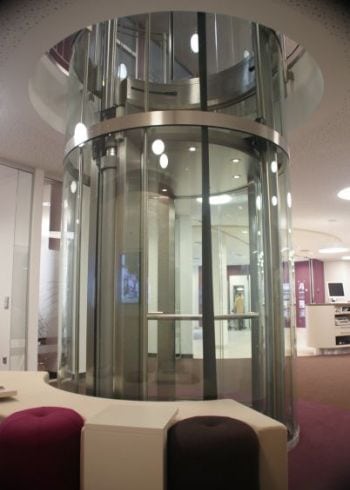 Ziel war es, im Empfangs- und Servicebereich einen filigran wirkenden, runden Aufzug zu haben, der nur wenig Raum beansprucht.