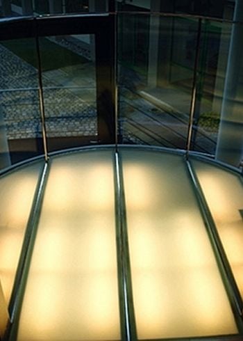 Aus einem leuchtenden Ring im Boden erhebt sich die Glassäule des Schachts und dringt durch eine linsenförmige Öffnung hinauf zur Galerie der ersten Etage.