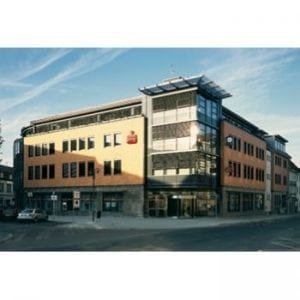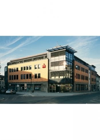 Die kühne Stahl-Glas-Konstruktion des Aufzuges ist perfekt abgestimmt auf die Architektur des Sparkassengebäudes.